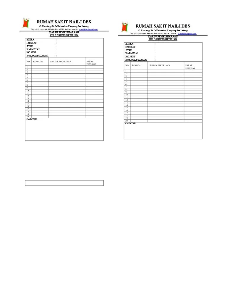 Untuk jalur umpb kirimkan ke email umpb@polibatam.ac.id; Sedangkan contoh arsip pribadi adalah akta kelahiran, kartu tanda. Contoh kartu maintanance identifikasi instalasi objek perawatan nama mesin : Buat teks box, lalu beri judu, kartu perawatan dengan menuliskan nama tempat servis, alamat tempat servis, dan nomor telpn. Contoh format kartu catatan historis dapat dilihat pada gambar 4. Anda bisa mendapatkan respon cepat untuk berbagai kebutuhan yang berkaitan dengan produk ac yang dibeli. 1 pebruari 2009 nomor mesin . Pengelompokan mesinperalatan di laboratoriumbengkel kerja. Informasi yang dicatat pada kartu catatan historis adalah: Surat keterangan tidak mampu dari kelurahan . Inilah contoh lembar checklist perawatan ac dan hal lain yang berhubungan erat dengan contoh lembar checklist perawatan ac serta aspek k3 secara umum di . Kartu pemeliharaan air condition th 2011. Ac lg s05lg tanggal pembelian :